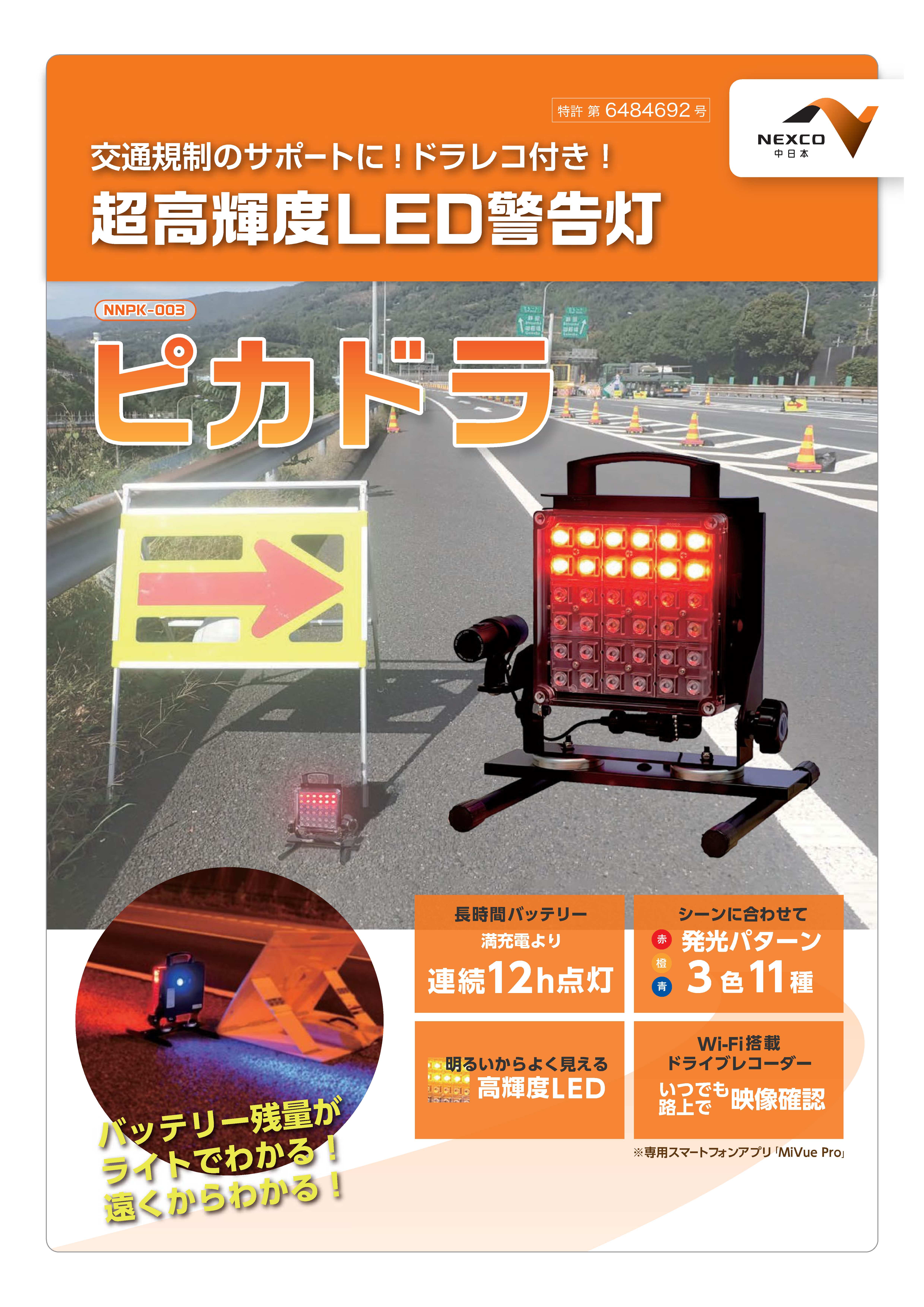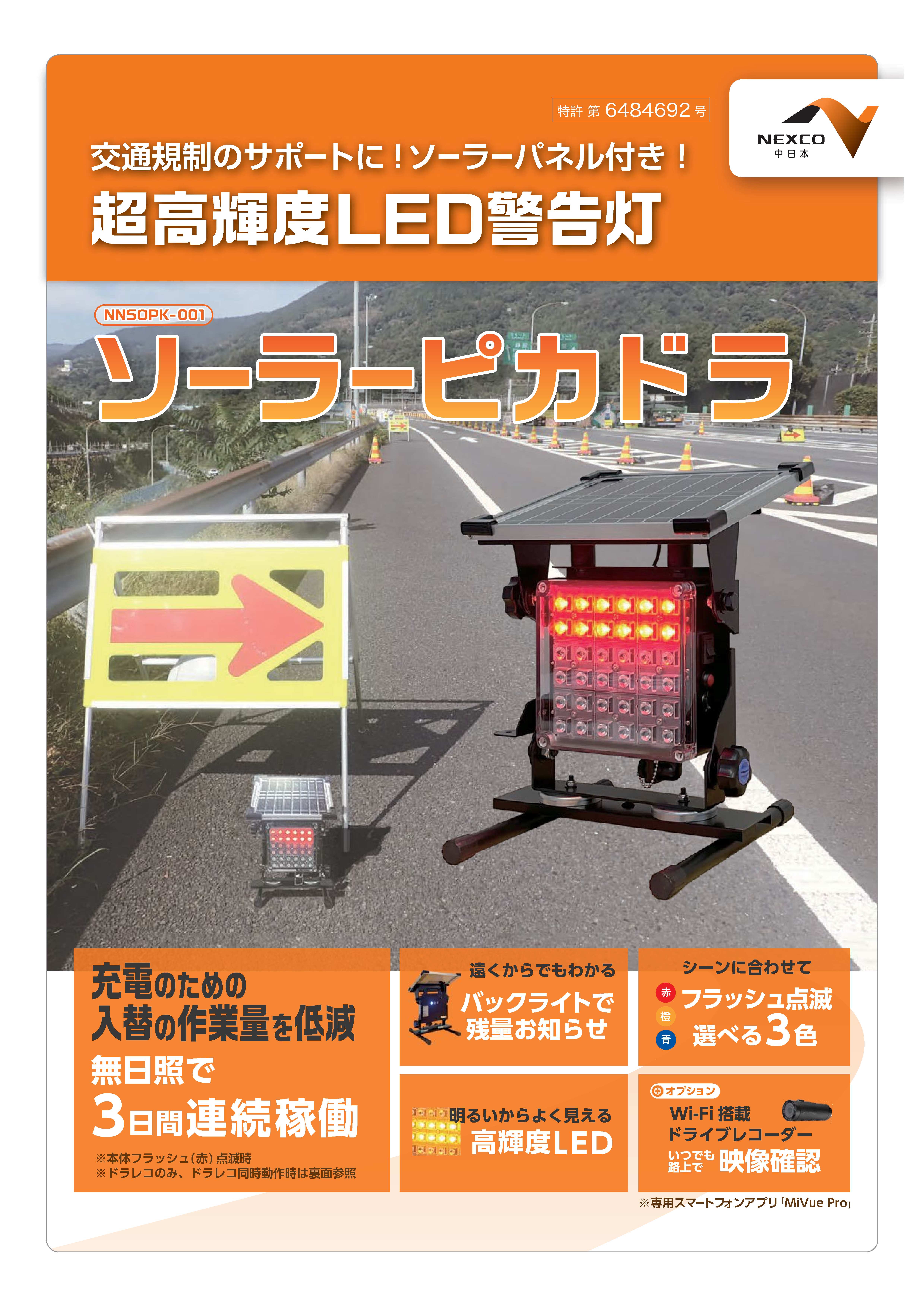 交通規制のシーンに合わせ、1台でLED3色(赤・青・黄)の使い分けが可能。 付属のドライブレコーダー(ソーラーピカドラはオプション)により録画装置を付加することで規制監視体制(事故等)を強化できる。また、監視はWi-Fi機能により遠隔地での監視も可能。 背面の電池残量計は、その場から確認可能で作業員の安全をサポートできる。 |